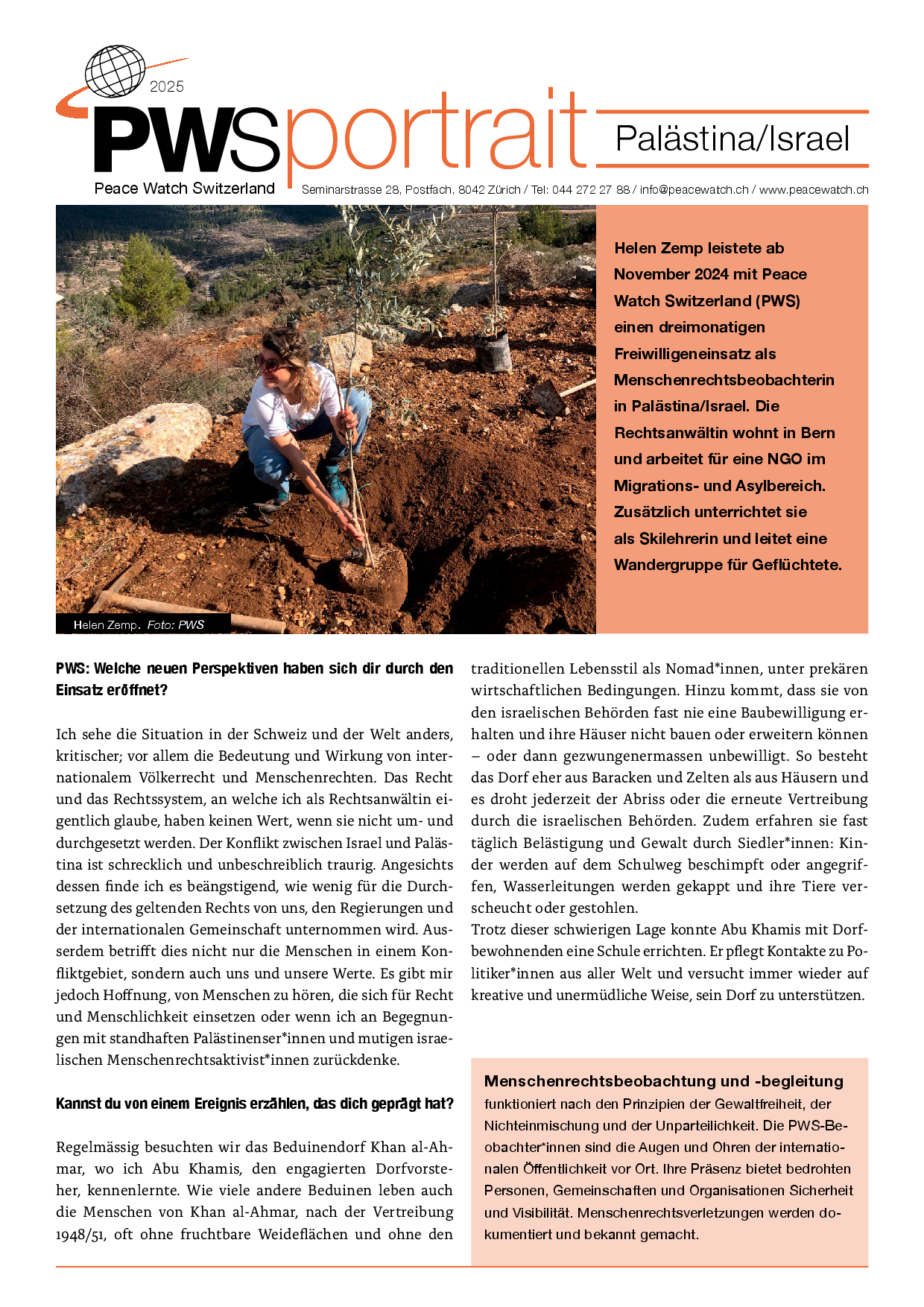 Helen Zemp war 2024/2025 für einen dreimonatigen Einsatz als Menschenrechtsbeobachterin in Palästina/Israel. Sie ist Rechtsanwältin und arbeitet bei einer NGO im Migrations- und Asylbereich. Im PWS-Portrait erzählt sie von der Stärke, Kreativität und Standhaftigkeit der begleiteten Menschen und davon wie die Begegnungen mit diesen Menschen sie geprägt haben. Sie betont auch, dass die Begleitarbeit des EAPPI-Programmes trotz Einschränkungen und der sich immer weiter verschlechternden Lage wichtig bleibt. PDF-Version