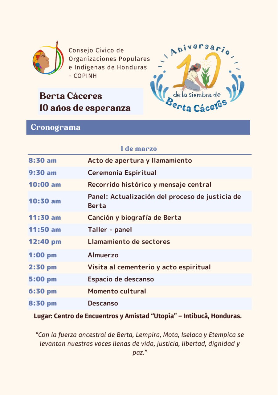 Anlässlich des 10. Jahrestages ruft COPINH zu Gedenk- und Mobilisierungsaktionen in Honduras und international auf. Organisationen und Bewegungen weltweit werden eingeladen, Aktionen – unter anderem vor honduranischen Botschaften – durchzuführen und umfassende Gerechtigkeit für Berta Cáceres und das Volk der Lenca zu fordern.