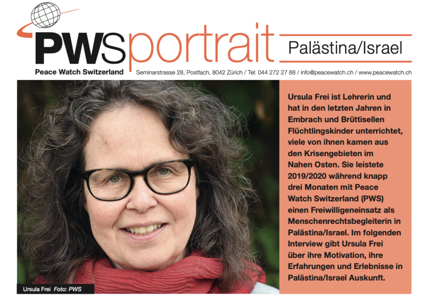 Ursula Frei leistete 2019/2020 mit Peace Watch Switzerland während drei Monaten einen Einsatz als Menschenrechtsbegleiterin in Palästina/Israel. Im folgenden Portrait erzählt sie uns von ihren Erfahrungen und Erlebnisse aus dem Einsatz.