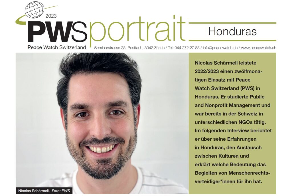 Nicolas Schärmeli leistete 2022/2023 einen zwölfmonatigen Einsatz mit Peace Watch Switzerland (PWS) in Honduras. Er studierte Public and Nonprofit Management und war in der Schweiz in unterschiedlichen NGOs tätig. Im folgenden Interview berichtet er über seine Erlebnisse in Honduras, den Austausch zwischen Kulturen und erklärt welche Bedeutung das Begleiten von Menschenrechtsverteidiger*innen für ihn hat.