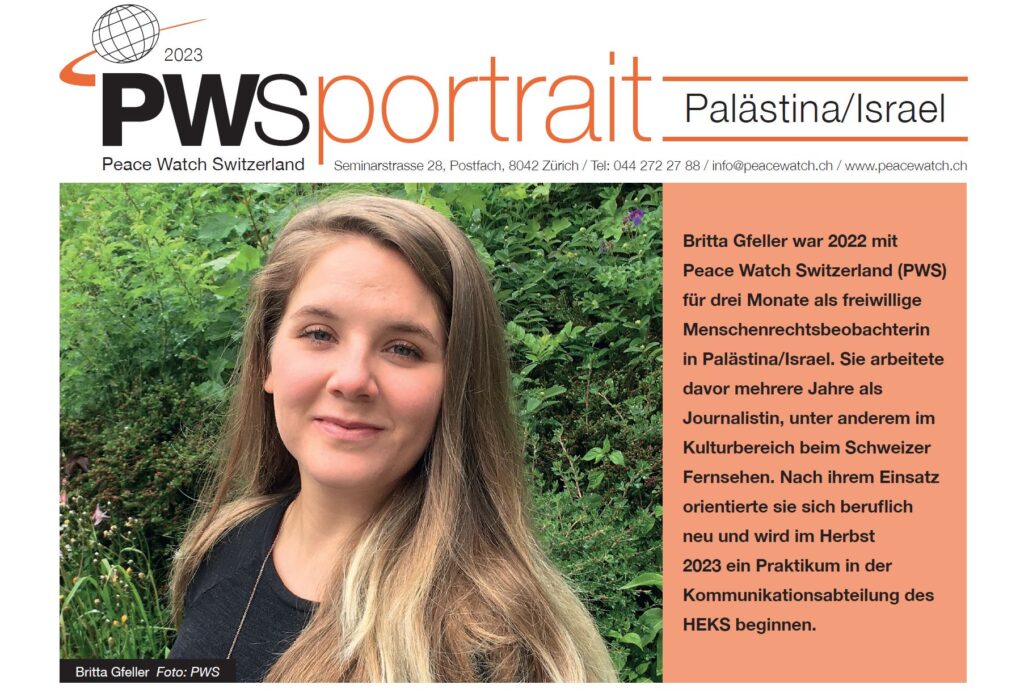 Britta Gfeller leistete 2022 mit Peace Watch Switzerland (PWS) einen dreimonatigen Freiwilligeneinsatz als Menschenrechtsbeobachterin in Palästina/Israel. Sie arbeitete davor mehrere Jahre als Journalistin. Nach ihrem Einsatz orientierte sie sich beruflich um. Im folgenden Interview gibt sie über ihre Motivation, ihre Erfahrungen in Palästina/Israel und darüber, wie der Einsatz sie geprägt hat, Auskunft.