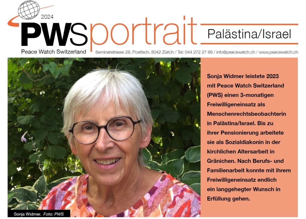 Sonja Widmer leistete 2023 mit Peace Watch Switzerland (PWS) einen 3-monatigen Freiwilligeneinsatz als Menschenrechtsbeobachterin in Palästina/Israel. Bis zu ihrer Pensionierung arbeitete sie als Sozialdiakonin in der kirchlichen Altersarbeit in Gränichen. Nach Berufs- und Familienarbeit konnte mit ihrem Freiwilligeneinsatz endlich ein langgehegter Wunsch in Erfüllung gehen. Lesen Sie das Interview mit ihr hier.