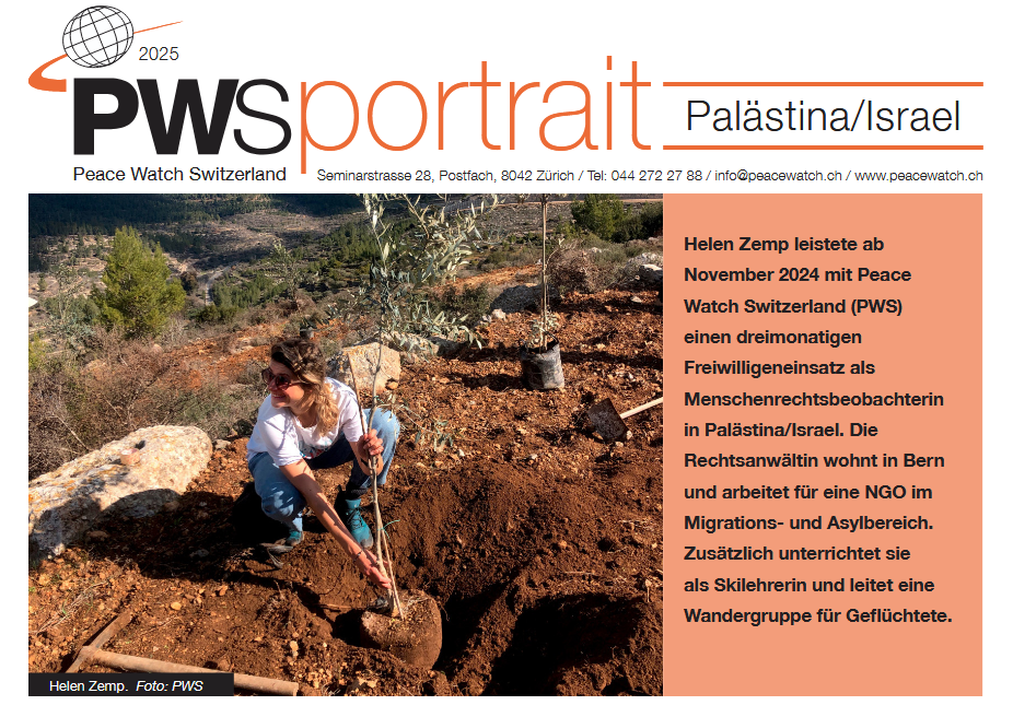 Helen Zemp war 2024/2025 für einen dreimonatigen Einsatz als Menschenrechtsbeobachterin in Palästina/Israel. Sie ist Rechtsanwältin und arbeitet bei einer NGO im Migrations- und Asylbereich. Im PWS-Portrait erzählt sie von der Stärke, Kreativität und Standhaftigkeit der begleiteten Menschen und davon wie die Begegnungen mit diesen Menschen sie geprägt haben. Sie betont auch, dass die Begleitarbeit des EAPPI-Programmes trotz Einschränkungen und der sich immer weiter verschlechternden Lage wichtig bleibt.